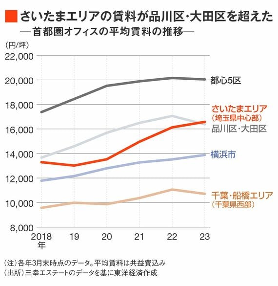 オフィスの新規供給が限定される中、さいたまエリアのオフィスビルの平均賃料は2020年以降、上昇している。2022年には品川・大田区の平均賃料を、さいたまエリアのオフィスの平均賃料が上回っている。