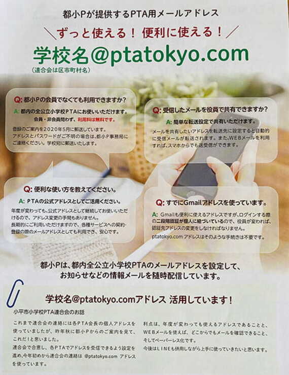 「これまで、都小PからP連、単Pへの情報提供は、ホームページによる発信に加え、会員・非会員の区別なく全校のPTA宛てに『PTA東京かわら版』や広報誌など紙媒体を郵送していたのですが、役員さんがいつ学校に足を運ぶことができるかわからない状態になってしまったので、提供したメールアドレスを活用いただくことで、情報共有や発信のためのプラットフォームになりうるだろうと。都小Pとしてドメインを契約しているので利用は無料ですし、同じアドレスをPTAでずっと利用できるため、会長さんが変わっても経年でPTAのメールを管理できることもメリットだと思います」(岡部氏、以下同じ)