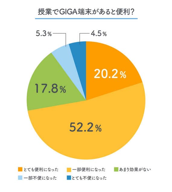 まず調査では、GIGAスクール構想で整備された端末(以下、GIGA端末)によって、便利になったかどうかについて聞いている。「とても便利になった」(20.2%)と「一部便利になった」(52.2%)と肯定的な評価が70%以上に達したが、「あまり効果がない」(17.8%)、「一部不便になった」(5.3%)、「とても不便になった」(4.5%)という否定的な評価も30%近くあった。