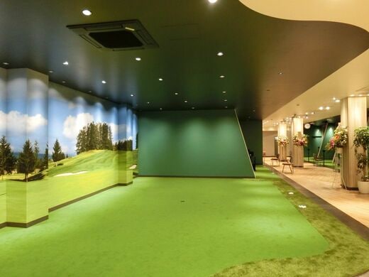 場内は元パチンコ店のメリットが生かされている。まず、天井が高い。3.4メートルあり、インドアとはいえ閉塞感がない。打席は10打席(うち1つは個室)で、人工芝のパッティンググリーンも広く取っている。5、6打席あれば「大型インドア練習場」とされるので、パチンコホールの広さが生きている。