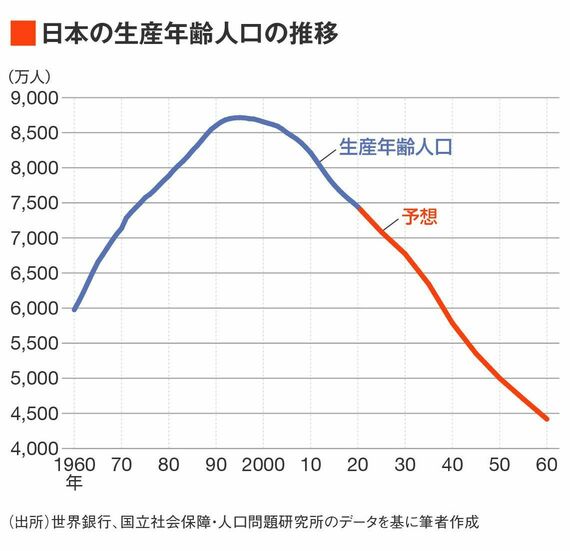 しかし日本では、これから何十年にもわたって人口が減ります。とくに経済を支える生産年齢人口は、他の年代層を大きく上回る急激なペースで減少します。