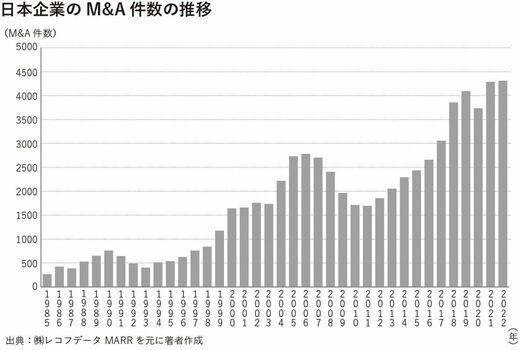 日本企業のM&A件数は年々増加しています。2020年はコロナ禍の影響で減少したと見られますが、2022年は4304件で、過去最多となっています(下図参照)。