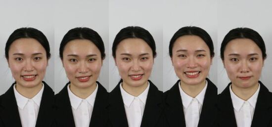次の5つの画像(左から順に①~⑤とします)は、あなたの意見を聞いているときの相手の表情です。それぞれの表情で「それは良いですね」と反応しているとします。この中に本意ではない表情(複数可)が含まれています。どれでしょうか?