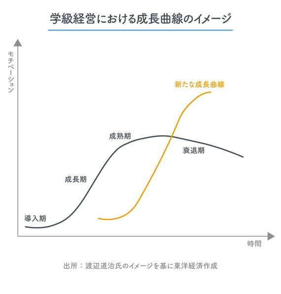 経営の安定に大切なのは、衰退期を見越して新たな成長曲線を創出していくことだとされていますが、実は学級経営においてもこうした見えない成長曲線が存在し、その点を意識することが大切になります。