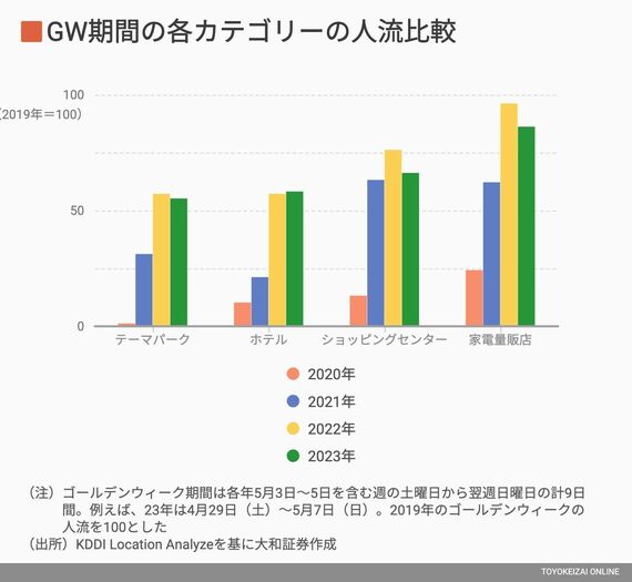 ちょうど1年前の当コラムでも指摘したように(「ゴールデンウィークが『最後の宴』となったわけ」)、2022年のGWもかなり人出が多かったが、今年は一段とアフターコロナが意識される中で、「テーマパーク」や「ホテル」が前年を大きく上回るという期待があった。このことを考慮すると、期待値対比では物足りない印象である。