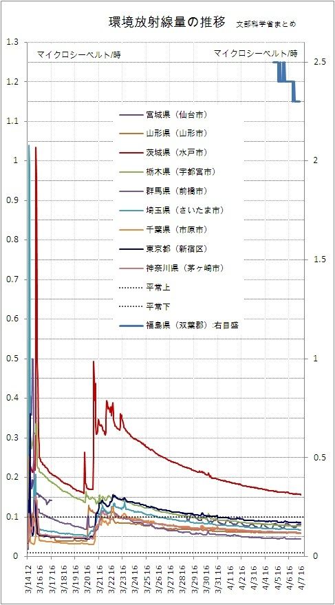 福島原発が事故を起こして以来、関東・東北地方で、空気中の放射線(環境放射線)レベルの高い状態が続いている(右図)。福島、茨城のみならず、東京でも3月15日の10時台には、毎時0・809マイクロシーベルトという数値(最大値)を観測。「通常の20倍以上もの環境放射線量」と報道され、多くの人々が不安感を覚えた。