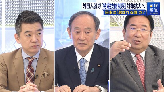 また、人手不足の分野で外国人労働者を受け入れる在留資格「特定技能」のうち、熟練した技能を有する外国人労働者を対象に在留期間更新に制限がなく、家族も帯同できる「特定技能2号」を現行の2分野(建設、造船)から11分野に拡大する案を政府が検討していることをめぐり、菅氏は「(移民をどうするか)真正面の議論を避けてきた。その(特定技能を有する外国人労働者を徐々に受け入れるという)スピードではもう難しくなっているのが現実だ」と述べ、移民政策について「思い切って方向性を出さなければならない時期に来てしまったのではないか」と話した。