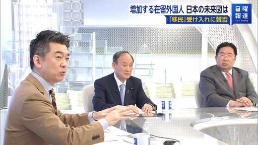 橋下徹氏(番組コメンテーター、弁護士、元大阪府知事):いま在留外国人の数はどんどん増えていて過去最多総人口の2.46%、約307万人になっている。外国人労働者数もものすごく増えている。こうなると外国人を単純に人手不足解消のための手段として考えるのではなく、社会の構成員として考えないと、いまもうひずみが出てきている。国立社会保障・人口問題研究所が将来の人口推計を出したが、あの中では年金について外国人の保険料を前提とする議論になっている。自民党内には移民政策は採らないと主張する人たちがいるが、現実がこうなっている以上はもう真正面から外国人を受け入れる、これはもう移民政策というべきだ。ただ、どういう外国人に来てもらうかということはしっかり考える、もうそういう議論をしなければいけないと思う。特定技能は、菅さんが突破してつくってくれたものだが、対象業種が限られている。日本側からこの業種に来てもらいたいと言っているだけだ。外国人からは違う業種で働きたいという要望がたくさんある。新聞報道では特に美容師などがすごい人気だそうだ。日本の美容師の技術はすごい。だけど在留資格がものすごく厳格でなかなかこの分野で外国人は働けない。この分野で働きたいという外国人労働者の要望を受けた政策をつくっていく必要がある。