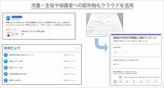 ほかにも、保護者会の出欠やアンケートも取りやすくなったという。学年便りや生徒指導、給食の献立など生徒への配布物もすべてクラウド化しており、紙はほぼ使っていない。保護者に関しても生徒とは別に配信システムがあり、配布物はすべてPDFで保護者のスマホやパソコンに配信されるようになっている。