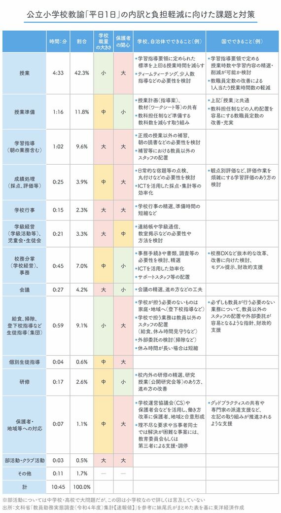 今回の調査にヒントはある。平均値にすぎない点には注意が必要だが、多忙の内訳については把握できているからだ。とはいえ、項目数が多くてややこしいので(この調査独特の言い回しもある)、このデータを基に編集し、多忙の要因別に、教員の負担軽減に向けて「学校、自治体でできること」と「国でできること」を例示した。ここに示したアイデア以外の取り組みや政策もあろう。多少でもたたき台になれば幸いだ。