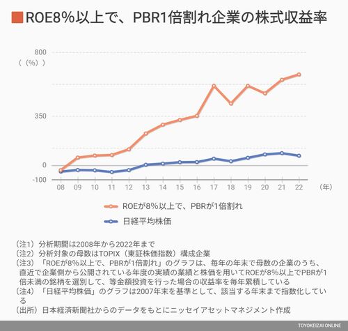 分析方法は次のようです。毎年の年末にTOPIX(東証株価指数)を構成する銘柄のうち、「ROEが8%以上でPBRが1倍割れ」の企業を選びます。それらの企業に同じ金額を投資した場合の収益率を2008年から2022年まで累積してみました。