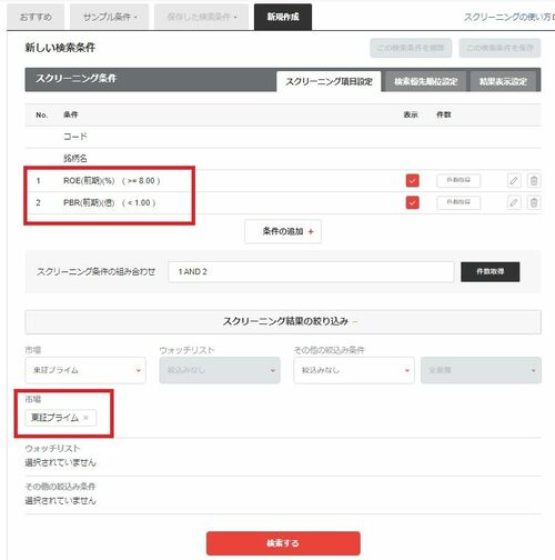最後に「スクリーニング結果の絞り込み」で「市場」を「東証プライム」に設定した後、「検索する」のボタンをクリックすれば、企業リストを見ることができます。