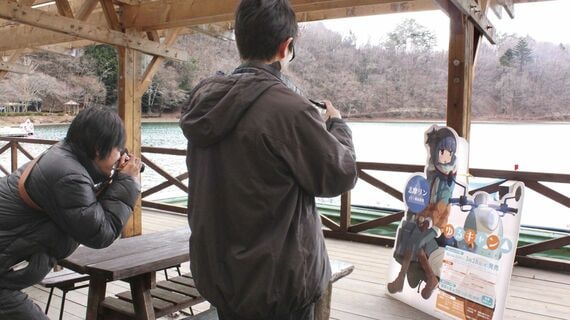 『ゆるキャン△』の舞台となった山梨県身延町。登場キャラのパネル前で写真を撮るファン(写真:共同通信)