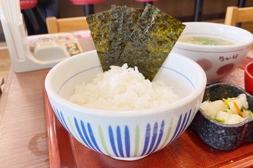 単品価格は割高なことが多いとはいえ、生卵とお新香とのりの180円分が、実質無料になっているのだと考えると、やはり朝メニューはお得です。