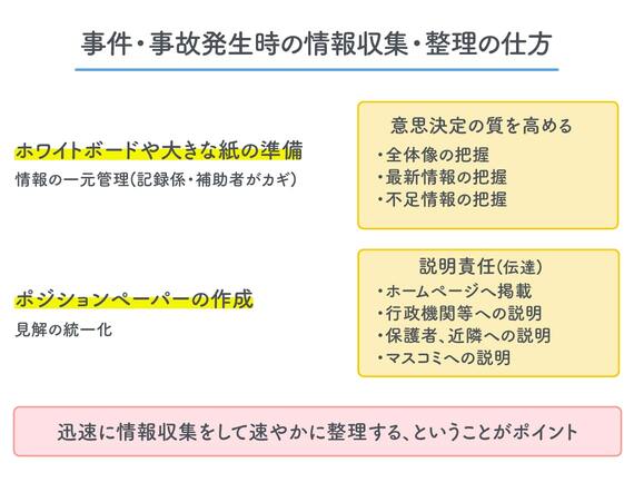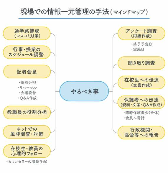 情報を集めた後は、それらを速やかに整理する必要がある。仮にテレビなどで大々的に取り上げられた場合は、翌日の児童・生徒の登校はどうするか、週末の野球部の試合には出場するのか、など意思決定すべきことが山ほど出てくる。宮下氏によれば、ホワイトボードなどにすべての情報を書き出して一元管理し、全体を把握しながらタスクを洗い出すことで判断の質が高まるという。