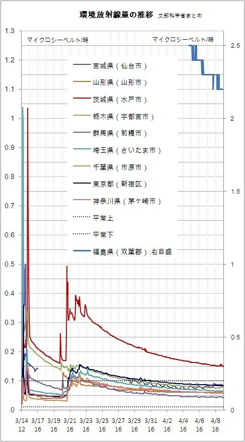 政治・経済・投資 放射線量の減少が続く、新たな大量の放射性物質の放出はないか 1分で読める 公開日時:2011/04/10 01:24 1/1 PAGES 文部科学省のまとめによると、関東各地の放射線量は減少している。4月9日は各地で雨が降ったため、大気中の放射性物質の地上への降下が想定されるが、それによる放射線量の増加はほぼ見られない。 3月15日の福島第一原発2号機の爆発による放射性物質の大量放出以降は、新たに大量の放射性物質の放出はないようだ。