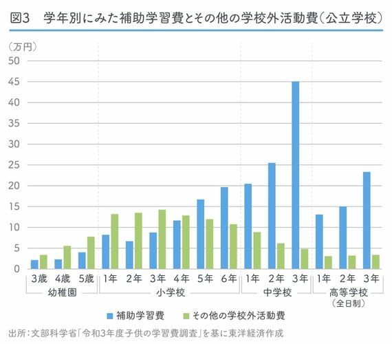 文部科学省の「子供の学習費調査」ではこんな結果も出ている。小学校4年生までの家庭では、塾などの補助学習にかける費用支出よりも体験活動(学校外活動)に充てる支出のほうが多い傾向にある。だがそれが5年生以上の家庭では逆転し、学習に充てる費用のほうが多くなるのだ(下記図3参照)。とくに中学生の段階で体験活動にかかる支出が抑制される背景には、中学校から始まる部活動があるのではないか、と同氏は言う。