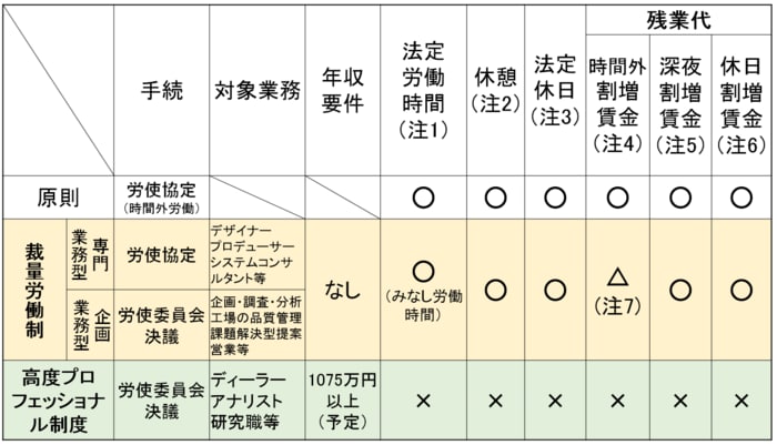 「たしかに、最大の違いは、残業代の有無です。『高度プロフェッショナル制度』では、労働基準法の定める法定労働時間と休憩・休日の規制が適用されません。さらに、時間外・深夜・休日労働の割増賃金が発生しないことになりますので、『残業代ゼロ」になるとの批判を受けています。