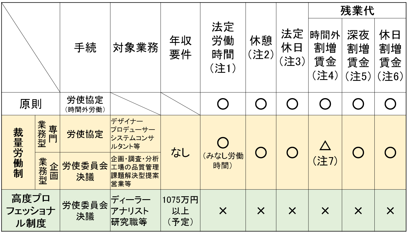 裁量労働制と高度プロフェッショナル労働制の違い(注1)法定労働時間は、1日8時間、週40時間(注2)1日の労働時間が6時間を超える場合:45分以上の休憩時間を付与、1日の労働時間が8時間を超える場合:1時間以上の休憩時間を付与(注3)法定休日として、1週1日又は4週4日以上の休日を付与 (注4)法定労働時間を超える時間外労働について、以下の残業代が発生 1ヶ月の合計が60時間まで:割増率25%以上、1ヶ月の合計が60時間を超えた場合:割増率50%以上(ただし、一定の中小企業は猶予(注5)深夜労働(午後10時から午前5時まで)について、割増率25%以上の残業代が発生(注6)法定休日労働について、割増率35%以上の残業代が発生(注7)みなし労働時間が法定労働時間を超える場合に発生。みなし労働時間が法定労働時間以下の場合は、実労働時間がみなし労働時間を超えても、時間外労働の割増の残業代は支給されない