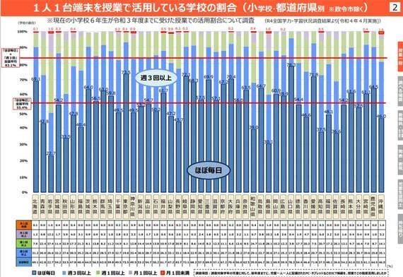 このほか、22年4月から夏休みまでの間における1人1台端末の利活用の状況を小中学校に聞いた別の調査では、児童生徒が自分で調べる場面で端末を活用している学校の割合は「ほぼ毎日、毎時間」と「ほぼ毎日」を合わせても2割台。児童生徒が自分の考えをまとめ、発表・表現する場面で端末を活用している学校の割合も「ほぼ毎日、毎時間」と「ほぼ毎日」は計1割台と、多くの学校ではまだ利用が日常化してないのが現状です。これは1年前のデータなので、その後改善が進んでいるとは思いますが、さらに活用を加速させていく必要があります。