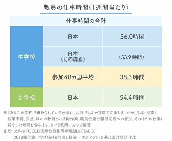 その中でも、日本の教職員の多忙さは世界でもダントツの1位、という問題からは目を背けることができない。「OECD(経済協力開発機構)国際教員指導環境調査(TALIS)2018報告書」によると、日本の教員の1週間当たりの仕事時間は中学校で56.0時間、小学校では54.4時間と、どちらも参加国中いちばん多い。