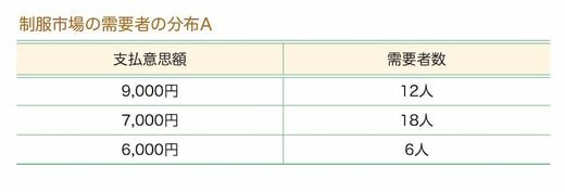 「私たちが制服を独占して生産する企業だと考えてみましょうか。制服を作るのに1着当たり5000円の費用がかかると仮定します。市場で9000円まで支払う意思がある需要者は12人、7000円までが18人、6000円までが6人だとすると、価格をいくらに設定するとき利潤が最も大きくなるでしょうか?」