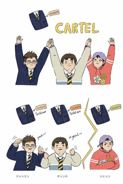 「でも、企業が談合の約束を守るのは、口で言うほど簡単じゃないんです。シヒョンは2万円で売ろうという約束を守ったけれど、ギョンホとチャンミンは守らなかったのを見れば、わかりますよね。しかも、制服はそれぞれ1着ずつ作ることにしていたのに、ギョンホは2着も多く作ったわけだし! 約束を守ったシヒョンだけが、5000円かけて作った制服を売れなくて損したわけよね」とナ先生が言った。