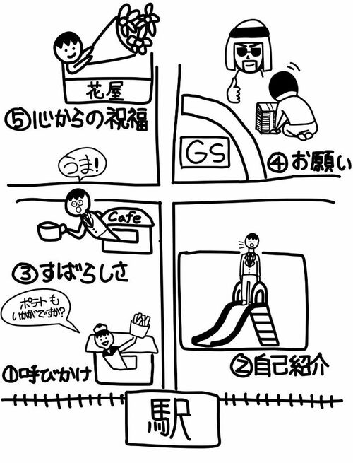 2つ目のイメージは、最寄駅から家までの帰り道に、スピーチのタグを貼り付ける方法です。