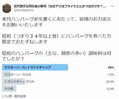先日、昭和時代にハンバーグを食べた方限定で、「昭和のハンバーグの(主な、頻度の多い)調味料は何でしたか?」というアンケートをTwitter上でとりました。