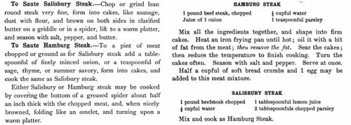 ハンバーグ・ステーキとソールズベリー・ステーキ、双方のレシピが掲載されている戦前のアメリカの料理書(『The Art of Cookery』、『A Text-book of Cooking』)を読み比べると、両者にはタマネギを使用する(ハンバーグ・ステーキ)、しない(ソールズベリー・ステーキ)という違いがあります。