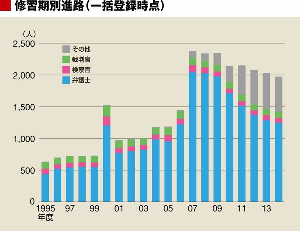 しかし、「この統計はあくまで修習終了直後の一斉登録時の統計であって、その申し込みの締め切りは9月。2回試験(修習終了時の考査)が終わってから就活に入ったり、入所した事務所の方針で1月登録になる人は含まれていない」(65期の弁護士)という。