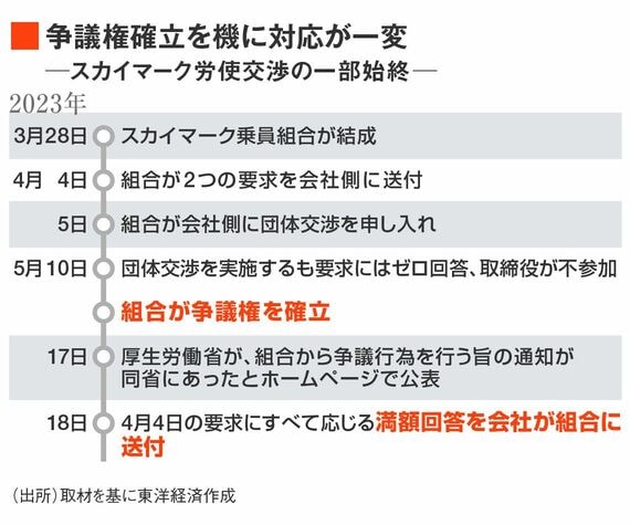 「事務所の提供やチェックオフなど、組合設立時にはよくある要求だ。またホテルの改善についても、宿泊が多いパイロットは、ゆっくり休めるホテルにしてほしいという要求は多い」。長年労務畑を歩んできた航空会社の元幹部社員は、スカイマークの要求についてこう解説をする。