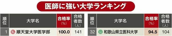 国家資格の合格率でみる「医師に強い大学ランキング」は、1位順天堂大学、2位が国際医療福祉大学自治医科大学など、ベスト10の11大学の内10大学を私立大が占める。上位の大学は手厚い国家試験対策に加え、私立の医学部としては学費が安いという共通点がある。