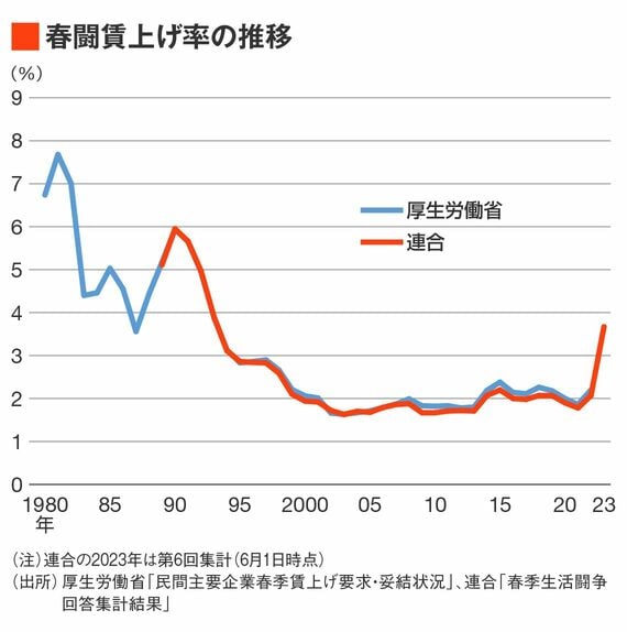 過去の春闘賃上げ率を見ても、オイルショック後の1980年代以降、前年よりも1%以上改善したことはなかった。