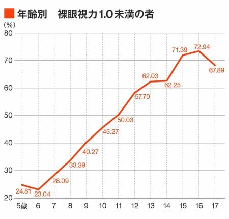 学校で実施されている視力検査では、視力1.0未満なら眼科の受診を勧められているが、文部科学省『令和3年度学校保健統計調査』によると、裸眼視力1.0未満の子どもは小学生が約37%、中学生は約61%で過去最多だ。低年齢で進行する子どもも増え、裸眼視力0.3未満の小学生は約30年前に比べて3倍以上になっている。
