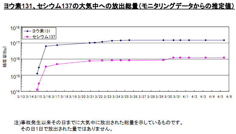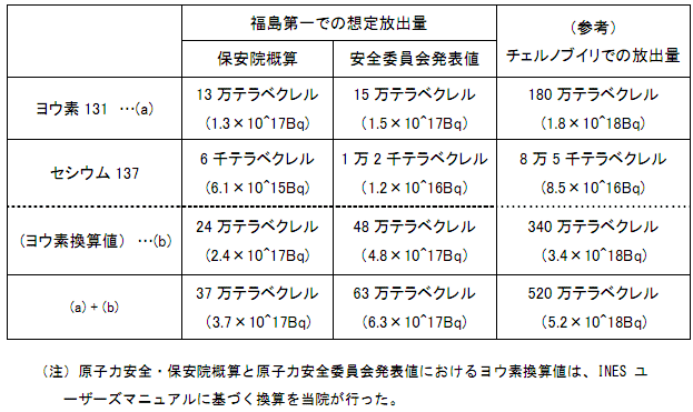 ヨウ素131とセシウム137について推定、ヨウ素換算で、保安院の推定では、37万テラ(3.7×10の17乗)ベクレル、安全委員会の推定では、63万テラ(6.3×10の17乗)ベクレルが放出されたという。