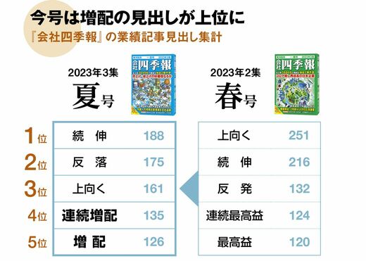業績拡大を受けて、四季報夏号の業績記事の見出しでも「続伸」が1位に。また好調な業績や東証の要請などを背景にした株主還元策の表明が相次ぐ中、「連続増配」「増配」の見出しも上位となった。