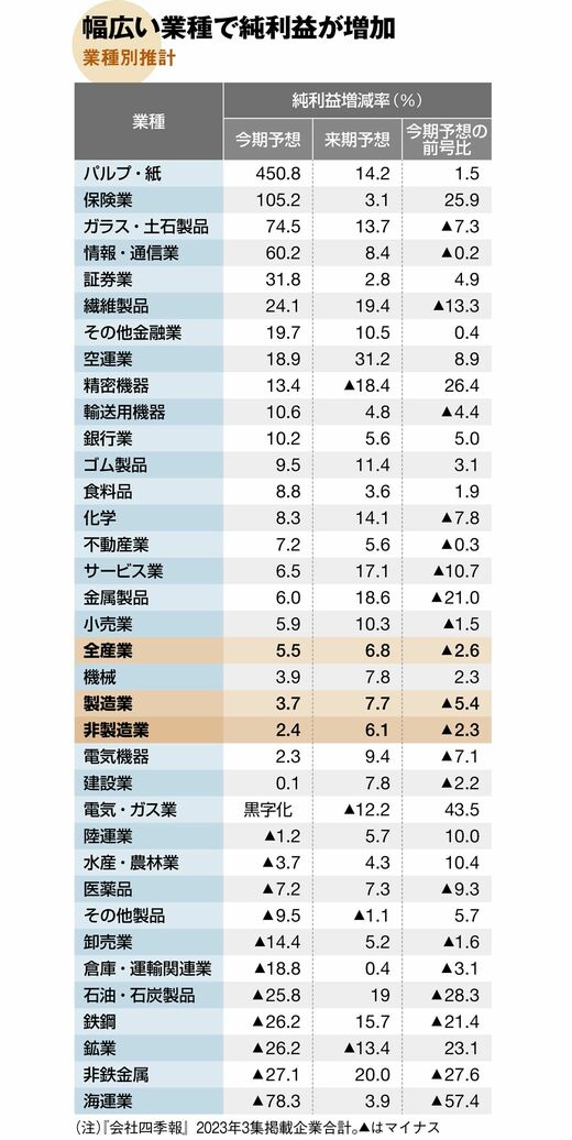 一方、大幅減益となる業種もある。代表的なのが海運業だ。コンテナ船の運賃高騰による前期の大幅増益から反落する。また原材料高の一服で非鉄金属、鉱業、鉄鋼といった素材産業も減益を見込む。ただし、各産業とも最終黒字を維持する見通しだ。