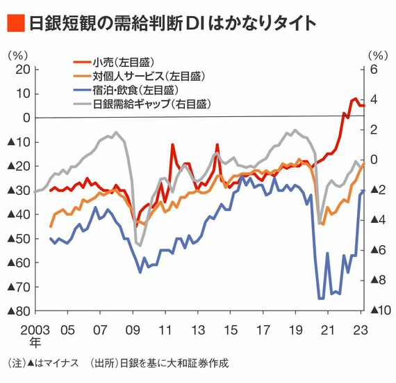 さらに判断が難しいのが「需給ギャップ」の取り扱いである。例えば、日銀が試算するマクロの需給ギャップは、消費者に近い「小売」「対個人サービス」「宿泊・飲食」の需給バランス(日銀短観の需給判断DI)と大きく異なる動きとなっている。
