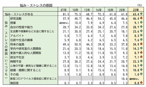 調査は研究活動に関することから、就職活動、経済事情まで多岐にわたる。この中で、悩みやストレスの原因についての質問では、「生活費や授業料などお金に関すること」の割合が、前回調査に比べて大幅に増えていた。
