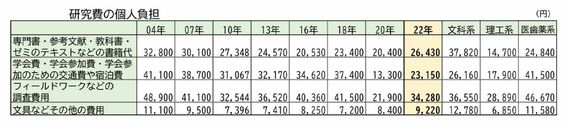 2点目は、研究費の自己負担が増加していること。専門書や参考文献などの書籍代、学会費、調査費用など全ての項目で自己負担は増えている。