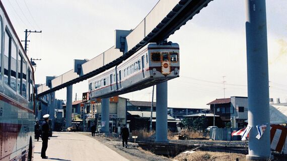1970年3月7日、湘南モノレール江の島線は、大船駅―西鎌倉駅間(4.7km)で部分開業を果たした。その前日の3月6日には11時から大船駅ホームで、中村梅吉モノレール協会会長、山本正一鎌倉市長、足立一郎湘南モノレール社長、および報道陣など約100名が出席し、横浜市消防局のブラスバンドのマーチを伴奏に、花電車の前でくす玉を割るなど「発車式」が執り行われた。続いて、正午から深沢の車庫横の広場に会場を移し、約1500人の関係者を招待して盛大な「開通記念式」も行われた。