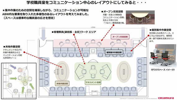 「本当はロッカー室や先生のリフレッシュスペースもあったほうがいい。でも、同じ空間かつ固定席であっても、このようにABWの要素を取り入れることで先生方のコミュニケーションをサポートすることはできるのです。こうした考え方をベースに、校種や学年、学校の特性、予算などによって検討するとよいのではないでしょうか。また、環境改善を足がかりに、職員室内を段階的に学年ごとのグループアドレス(※3)にし、最終的にフリーアドレスにしていくことは可能だと思います」(前田氏)