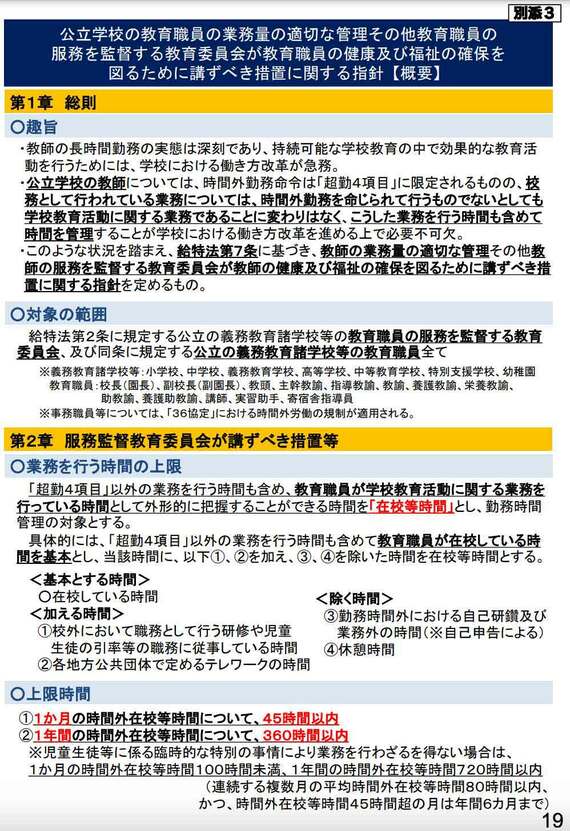 もう1つは、公立学校教員に対して、時間外の在校等時間(勤務時間)をモニタリングして、月45時間、年360時間以内にする指針がある。