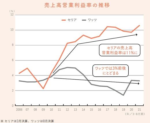 セリアの売上高営業利益率は2010年以降上昇し2021年には11%に達している一方で、ワッツは2010年以降大きな変化がない(出所)矢部謙介『決算書×ビジネスモデル大全』