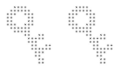 では、誰もが質のよい「凝視」をするためには、どうすればよいのでしょう。そこでたどりついたのが、クイズの王道「まちがいさがし」です。試しに、こちらの左右の図でまちがいを2つ見つけてください。マークの方向や種類のちがいに気をつけましょう。