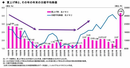 そこで実際に過去からの推移を見てみましょう。下図の棒グラフは毎年の賃上げ率の推移です。これに対して、日経平均株価は毎年の年末値となっています。2023年の賃上げ率は3.66%ですが、まだ年末になっていないため日経平均株価のグラフは2022年までの表示となっています。