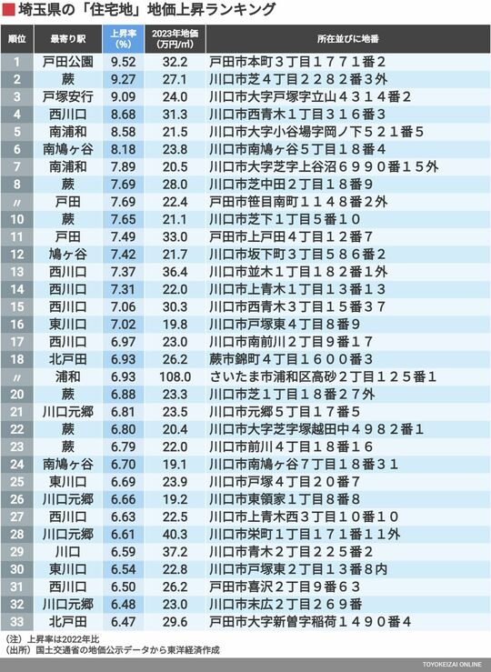 政治・経済・投資 上位に川口市がずらり、埼玉の地価上昇率TOP100 トップ10のうち8つは川口市、戸田市も上位に 2分で読める 公開日時:2023/07/02 05:40 東洋経済オンライン編集部 フォロー 1/6 PAGES 2/6 PAGES 次ページが続きます:【次は34~66位】 3/6 PAGES 4/6 PAGES 5/6 PAGES 6/6 PAGES