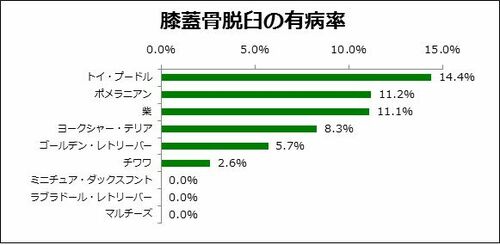 アニコム損害保険と理化学研究所の共同研究チームが、獣医学雑誌『The Journal of Veterinary Medical Science』で発表した研究結果によると、日本における人気の9犬種(トイ・プードル、チワワ、ミニチュア・ダックスフント、柴、ポメラニアン、ヨークシャー・テリア、マルチーズ、ゴールデン・レトリーバー、ラブラドール・レトリーバー)計2048頭の子犬(0歳齢)のパテラの有病率は、トイ・プードルがトップの14.4%。約7頭に1頭が発病していました。