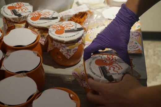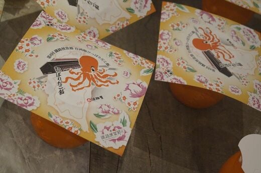 現地での調理に四苦八苦する中、日本から持ち込んだアイテムもある。ひっぱりだこ飯の外観的な一番の特徴といえる、たこつぼを模した独特な容器だ。今回、淡路屋は日本で売られているものと同じ容器に加え、色をオレンジとしてオリジナルの掛け紙を被せた台湾限定バージョンを用意した。中身は同じだが、その物珍しさに2種類買っていく人や限定品を目当てに購入しに来たという日本人観光客の姿もあった。
